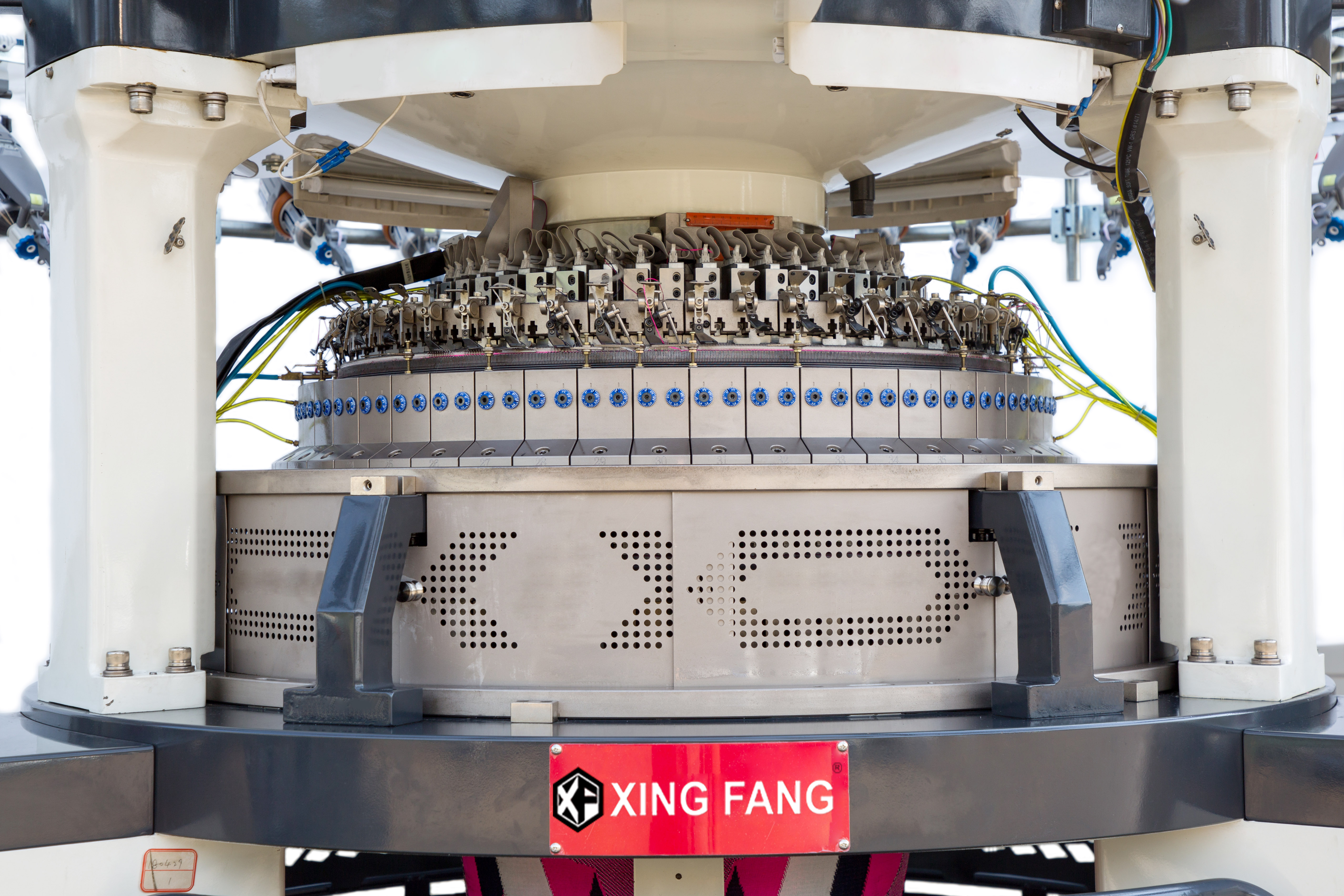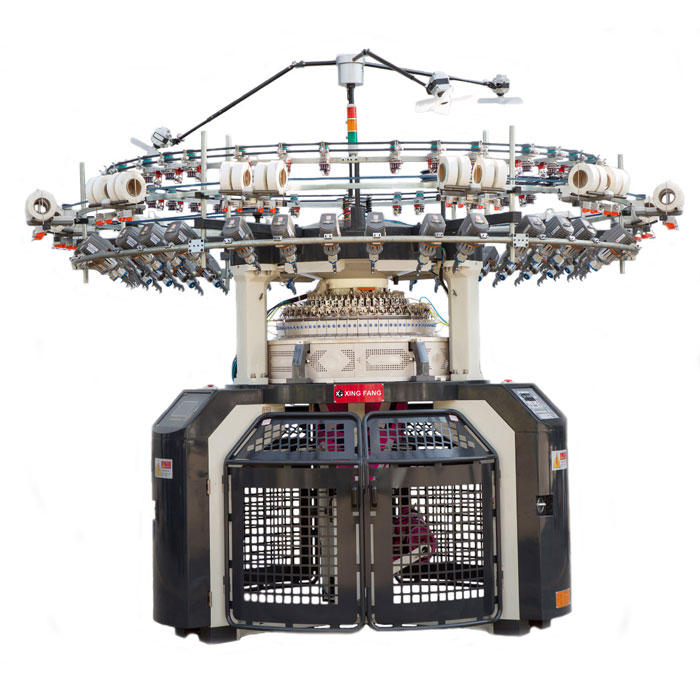 The machine uses computerized selectors to select needles in the cylinder with the 2-way or 3-way technique of knit, tuck and miss, which can produce fabric with different patterns without limitation. Any intricate pattern of fabric can be converted via computerized pattern preparation system into the special control command which instructs selectors to make jacquard fabric.